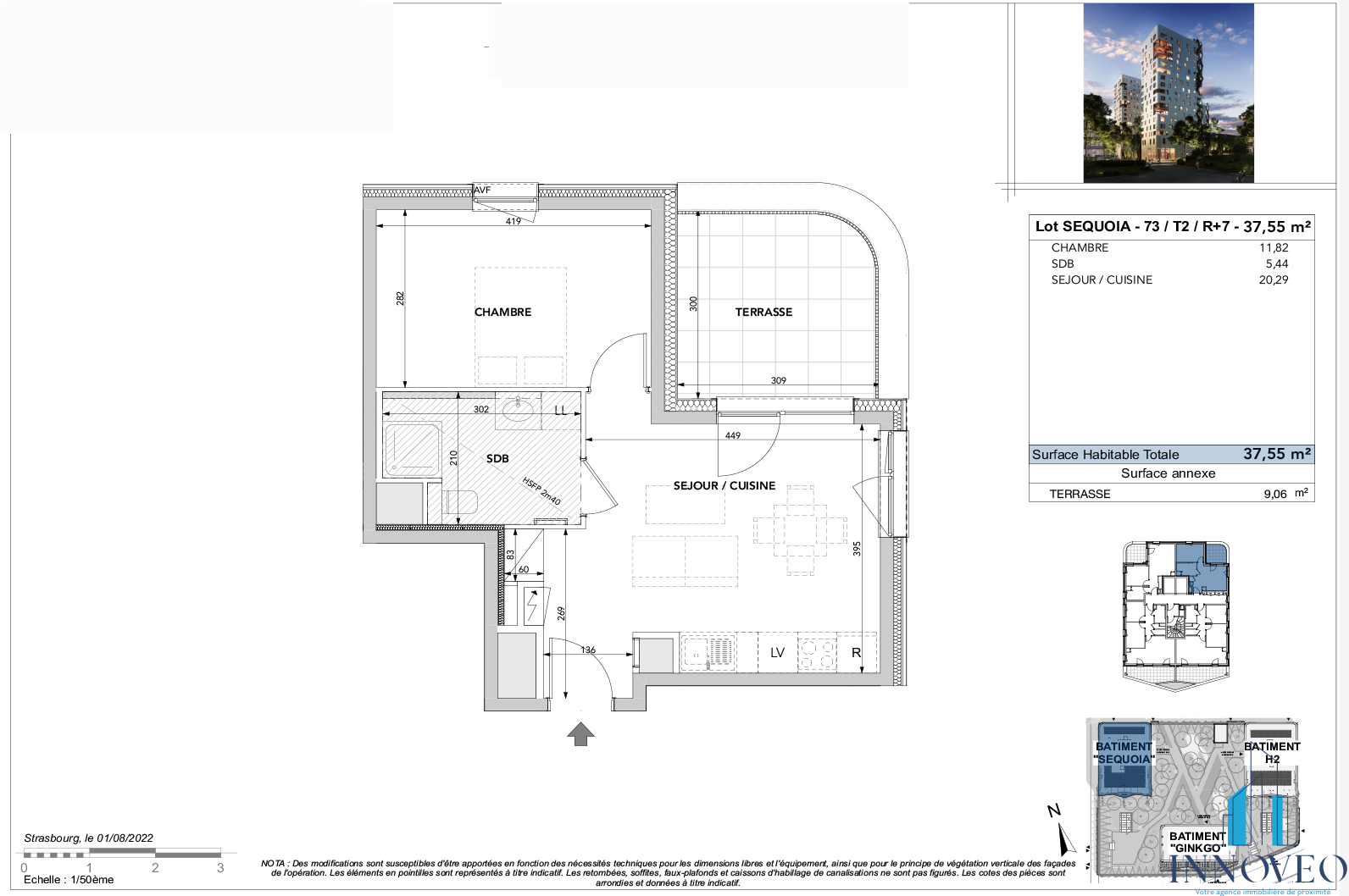 Il se compose d'une entrée, d'une pièce de vie de 20.29m² avec cuisine ouverte aménagée et équipée (four, plaque induction et hotte) et donnant sur une belle terrasse de 9.06m², d'une chambre de 11.82m² et d'une salle d'eau avec WC.