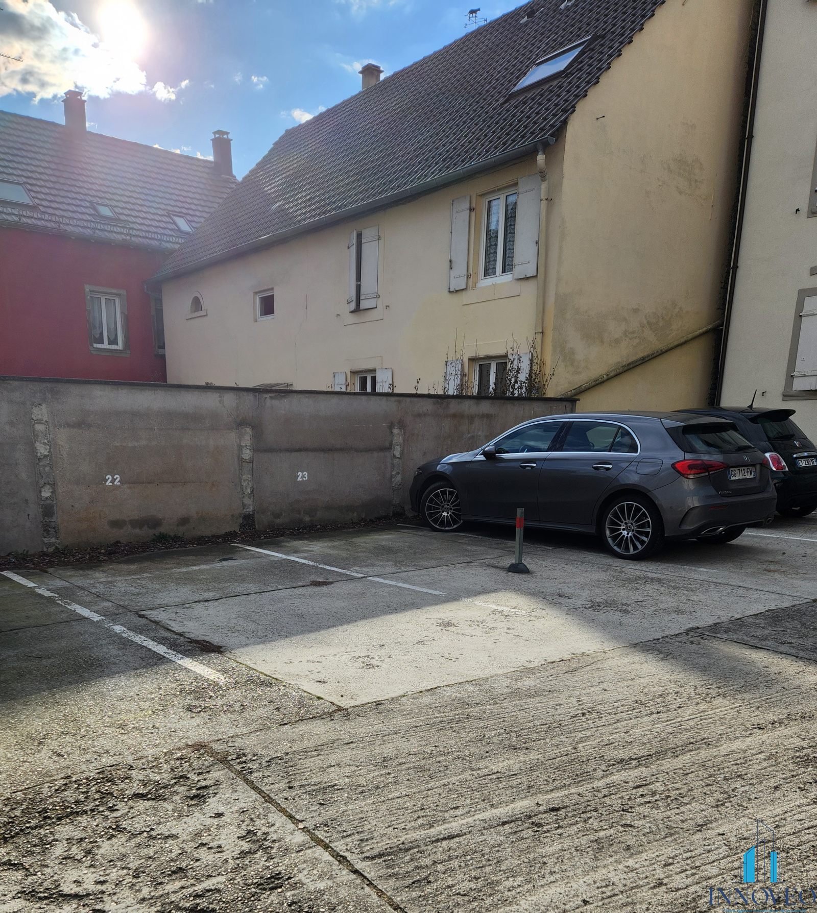 Un emplacement de parking de 12 m2 sécurisé par un poteau de stationnement rabattable avec clés.